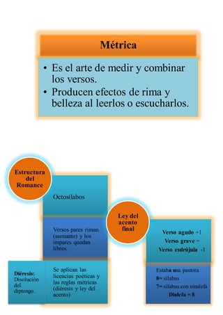 Este documento presenta un análisis métrico y estructural de un romance escrito por el poeta ecuatoriano Abel Romeo Castillo. Explica las características del romance como género poético y analiza la métrica y rima del romance específico titulado "Romance Criollo de la niña guayaquileña". También incluye breves biografías del autor y vocabulario clave utilizado en el poema.