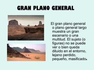 El documento describe diferentes tipos de planos utilizados en cinematografía, desde el gran plano general que muestra un amplio escenario hasta planos más específicos como el primer plano y el plano detalle. Cada tipo de plano tiene su función particular, ya sea descriptiva, narrativa, dramática o estética. Se detallan sus características y el impacto que generan en la percepción del espectador.