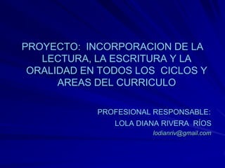 Este documento presenta un proyecto para incorporar la lectura, escritura y oralidad en todos los ciclos y áreas del currículo en cinco colegios. El proyecto busca mejorar la comprensión lectora y producción textual de los estudiantes a través de acompañamiento a docentes y representantes. Se implementará durante septiembre-noviembre de 2010 y febrero de 2011, con reuniones semanales en cada colegio para avanzar en la conceptualización de estas herramientas y elaborar un proyecto pedagógico inter