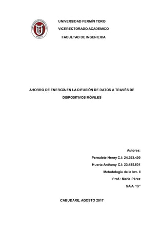 Este documento describe un proyecto de investigación sobre el ahorro de energía en la difusión de datos a través de dispositivos móviles. El objetivo es demostrar cómo se puede ahorrar energía mediante el uso de streaming P2P y diferentes tipos de conexión como Ethernet, WiFi y 3G. Se estudiará el consumo energético de cada método y se determinará cuál preserva mejor la duración de la batería.