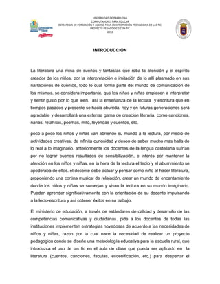 Este documento presenta un proyecto pedagógico que usa las TIC para desarrollar la capacidad creativa e interpretativa de la lectoescritura en estudiantes de segundo grado de una escuela rural. El proyecto diagnosticará las dificultades de los estudiantes a través de pruebas y encuestas, diseñará talleres literarios usando las TIC para superar estas dificultades, y evaluará los resultados para enriquecer el aprendizaje de los estudiantes.