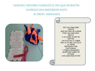 El proyecto trata sobre un caballero triste cuya dama ha sido raptada por una bruja y encerrada en la torre más alta de un castillo. Los alumnos investigan sobre caballeros, brujas y castillos para poder ayudar al caballero a rescatar a su dama. Recopilan información y comparten ideas para vencer a la bruja. Finalmente organizan su propio banquete medieval para celebrar el rescate de la dama.