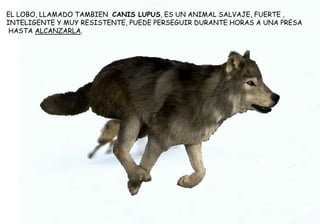 El lobo es un animal salvaje, fuerte e inteligente que vive en manadas y caza en grupo. Pertenece a la familia de los cánidos y es el más grande, con pelaje que varía de color según la región. Se comunican a través de aullidos y viven en guaridas, donde la loba da a luz entre 5 a 10 cachorros cada 60 días.
