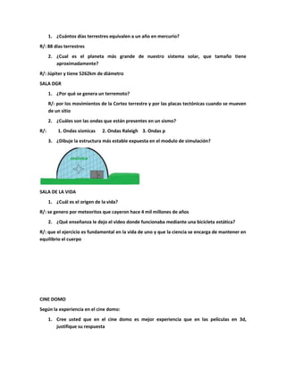 El documento resume varias salas de un museo interactivo que cubren temas como la energía del pensamiento, petróleo y gas natural, telecomunicaciones, efectos temporales, el sistema solar, terremotos, origen de la vida y una sala de cine domo. Cada sala contiene preguntas con respuestas sobre los conceptos cubiertos.
