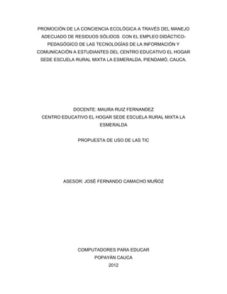 Este documento describe un proyecto diseñado para promover la conciencia ecológica en estudiantes de una escuela rural en Piendamó, Cauca, a través del manejo adecuado de residuos sólidos utilizando las TIC. El proyecto busca desarrollar estrategias pedagógicas para enseñar sobre reducción, reutilización y reciclaje de residuos, y cambiar actitudes hacia el cuidado ambiental.