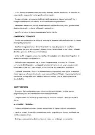 Este proyecto propone el uso de Google Earth como herramienta para que los estudiantes exploren el mundo virtualmente y aprendan sobre geografía. Los estudiantes aprenderán a usar Google Earth y luego investigarán las rutas de los viajes de exploración europeos a América en los siglos XV y XVI, trazando las rutas en Google Earth. Presentarán sus hallazgos oralmente y por escrito.