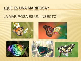 La mariposa es un insecto que pasa por diferentes etapas en su ciclo de vida, incluyendo huevo, oruga, pupa y adulto. Las mariposas tienen ocelos en sus alas para despistar a los depredadores como pájaros, murciélagos y arañas. Tanto las mariposas adultas como las orugas se alimentan de flores y plantas respectivamente.