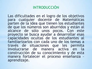Este documento describe un proyecto para enseñar matemáticas de manera más efectiva a estudiantes de grados 7o a 9o. El proyecto usa recursos como juegos y software interactivo para motivar a los estudiantes y ayudarlos a construir conocimientos matemáticos de manera activa. Incluye actividades lúdicas diseñadas para cada grado que reforzarán conceptos como ecuaciones, funciones y geometría a través de la dramatización, rompecabezas y maquetas tridimensionales.