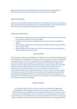 Este documento presenta una propuesta didáctica para mejorar el aprendizaje del inglés en estudiantes de 8o grado en el Colegio María Auxiliadora mediante el uso de las TIC y actividades dinámicas. La propuesta identifica los estilos de aprendizaje de los estudiantes y desarrolla actividades acordes a cada estilo para facilitar la comprensión de los temas. El objetivo es motivar a los estudiantes y mejorar sus resultados académicos en inglés.