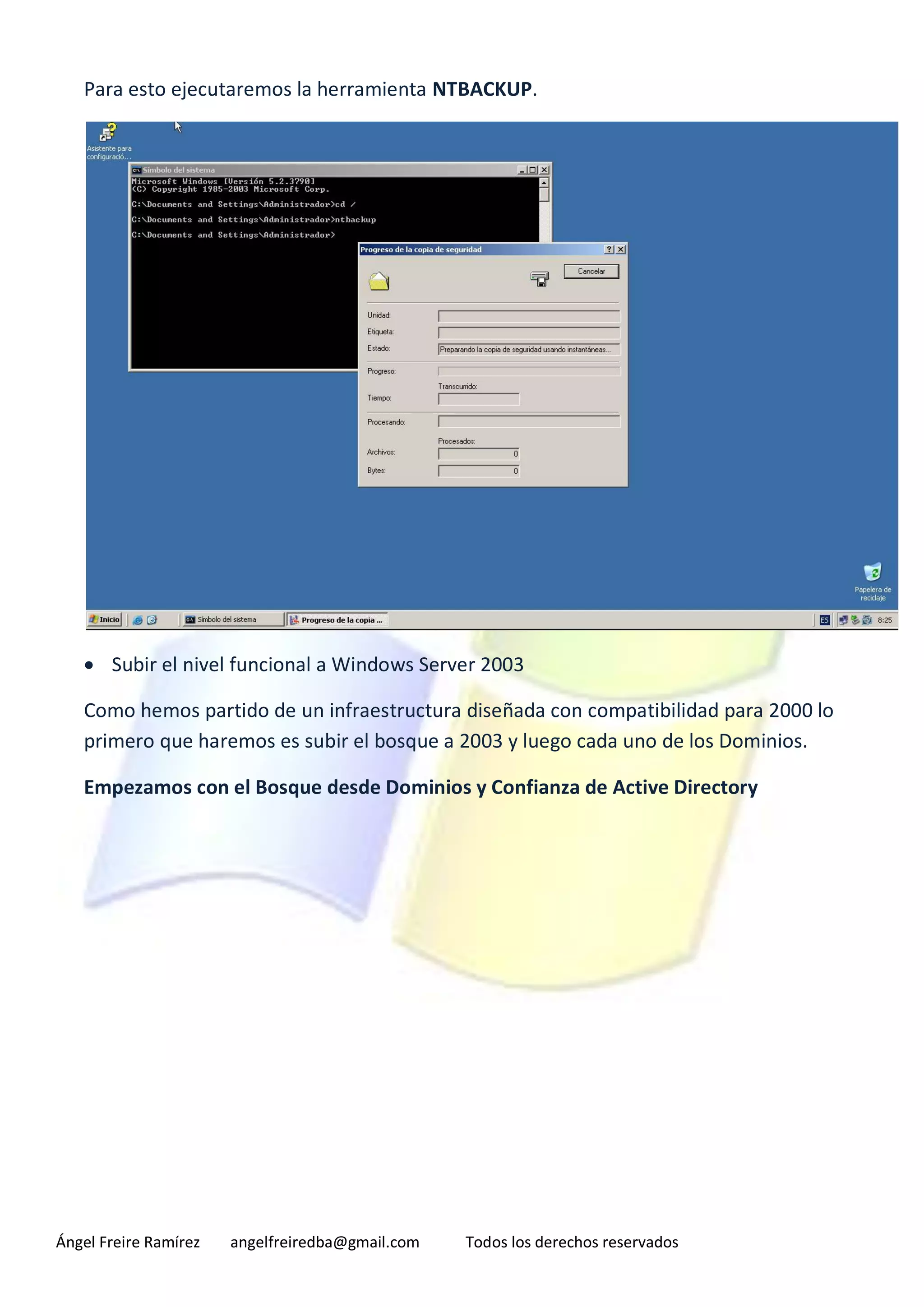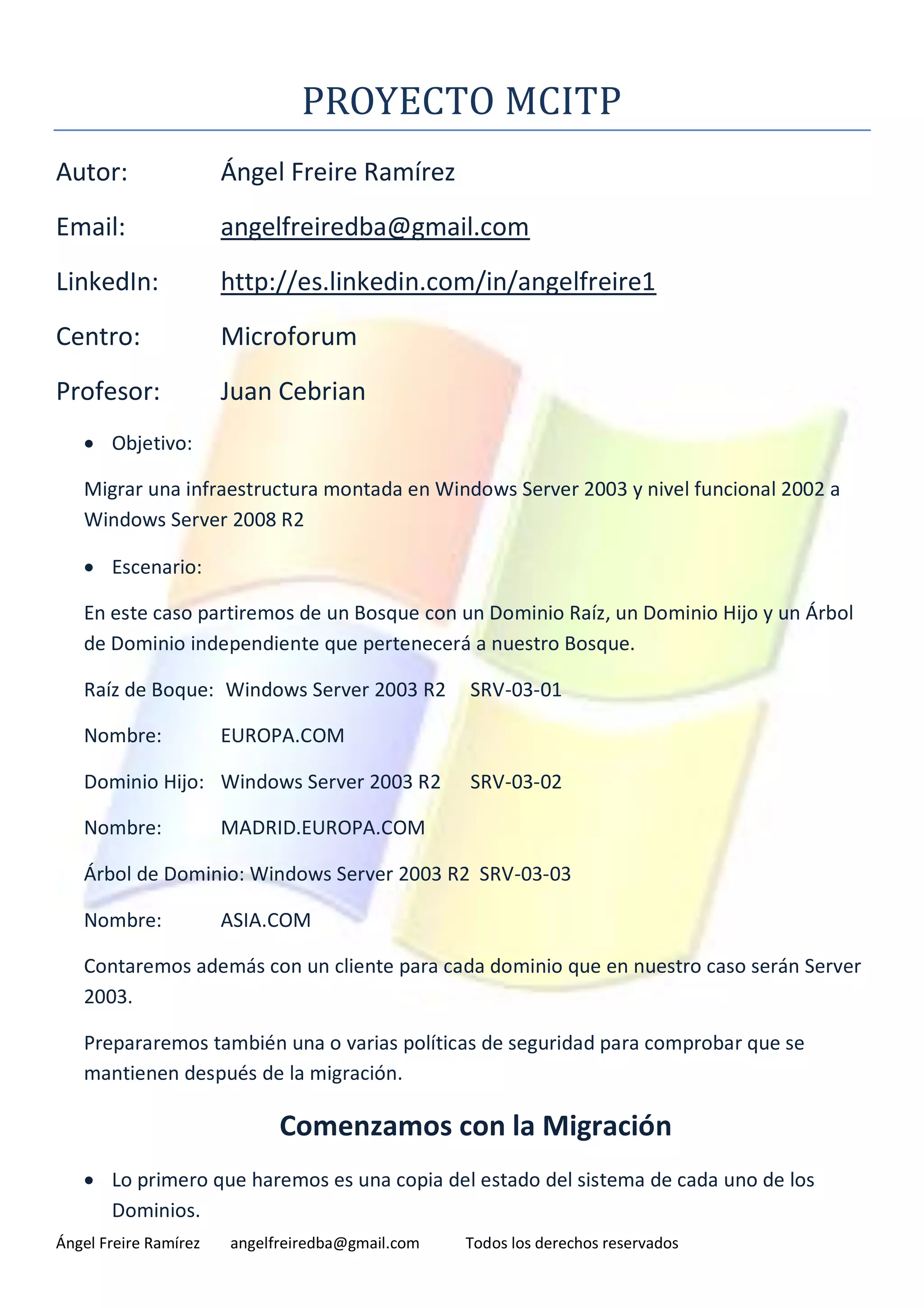 El documento describe un proyecto de migración de una infraestructura de Windows Server 2003 a Windows Server 2008 R2, involucrando la preparación y promoción de controladores de dominio. Se detalla el proceso de copia de estado del sistema, actualización del nivel funcional y la instalación de servidores adicionales, así como la transferencia de roles de dominio. Finalmente, se verifica la migración exitosa al asegurarse de que los clientes conserven sus políticas y se actualiza el nivel funcional del bosque y dominios a 2008 R2.