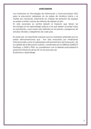 Este documento discute el impacto de las tecnologías de la información y la comunicación (TIC) en la educación. Examina tres escenarios por los que las escuelas pueden adaptarse a las TIC: tecnocrático, reformista y holístico. También analiza cómo las TIC pueden usarse como herramientas pedagógicas y cómo afectan las oportunidades educativas de manera desigual dependiendo del acceso a la tecnología. El documento concluye que las TIC deben integrarse de manera responsable y cre