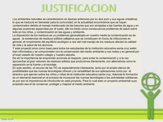 El documento aborda la problemática de la contaminación ambiental y la importancia del reciclaje en la Institución Educativa Santa Cruz, destacando los efectos negativos de la mala disposición de residuos sobre la salud de la comunidad y el equilibrio ecológico. Se plantean objetivos como la sensibilización de la comunidad educativa, la realización de jornadas de limpieza y el fomento del reciclaje a través de actividades educativas, resaltando el uso de tecnologías de información y comunicación. Se enfatiza la relevancia de construir una cultura ambiental que promueva la conservación y mejora del medio ambiente.
