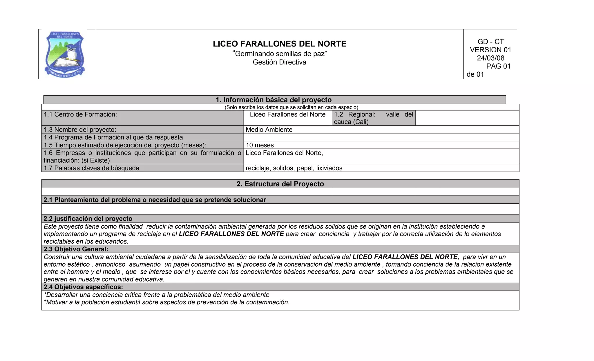 El documento presenta un proyecto ambiental del Liceo Farallones del Norte en Cali, Colombia. El proyecto busca implementar un programa de reciclaje durante 10 meses para reducir la contaminación causada por desechos sólidos en la escuela. El objetivo general es construir una cultura ambiental entre la comunidad educativa a través de la sensibilización sobre la relación entre el hombre y el medio ambiente, y los conocimientos básicos para crear soluciones a problemas ambientales. Los objetivos específicos incluyen desarrollar una conciencia cr
