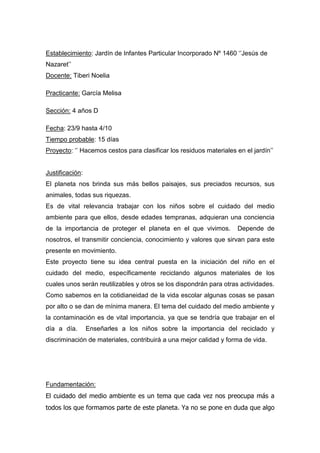 Este proyecto tiene como objetivo enseñar a los niños de 4 años sobre la importancia del cuidado del medio ambiente a través de la clasificación de residuos en cestos de diferentes colores. A lo largo de 15 días, los niños observarán videos, investigarán en el patio de la escuela, juntarán residuos para crear materiales, harán dibujos y cuentos sobre el tema, y finalmente crearán cestos para clasificar los residuos en el aula. El proyecto busca generar conciencia ambiental en los niños