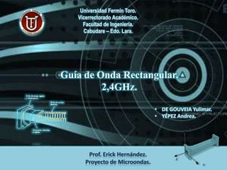 Este documento describe la simulación de una guía de onda rectangular de 2,4 GHz realizada con el programa FEKO. Se construyó una guía de onda rectangular con un puerto de entrada y salida. Se muestran las dimensiones de la guía, la propagación de los campos electromagnéticos y los parámetros S11 obtenidos. El objetivo es estudiar el comportamiento de una guía de onda rectangular a una frecuencia de 2,4 GHz.