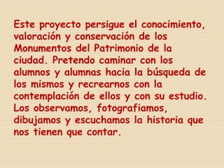 Este proyecto busca que los alumnos de 6o de primaria conozcan, valoren y conserven los monumentos históricos de su ciudad a través de tres fases: motivación e investigación inicial, investigación en el entorno y de los monumentos, y organización de la información recopilada en una revista o presentación digital. El proyecto se desarrollará a lo largo de un trimestre con sesiones semanales que combinarán trabajo en el aula y visitas a los monumentos.