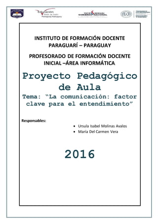 Este documento presenta un proyecto pedagógico de aula sobre la comunicación y la incomunicación. El proyecto tiene como objetivo principal concientizar sobre la importancia de la comunicación para el desarrollo de buenas relaciones. El proyecto incluye actividades como la presentación de videos, debates e intercambios de ideas sobre conceptos como la comunicación, la incomunicación, sus factores y consecuencias. El proyecto concluye que la comunicación es fundamental para la interacción humana y que la falta de ella puede generar problemas en las relaciones personales y
