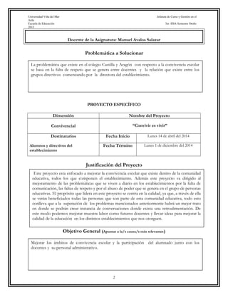 Este documento presenta un proyecto para mejorar la convivencia escolar en el Colegio Castilla y Aragón. El proyecto se enfoca en mejorar las problemáticas de falta de respeto entre docentes, directivos y alumnos. El objetivo general es mejorar los ámbitos de convivencia e involucrar a toda la comunidad educativa. El proyecto consta de tres módulos que abordan los objetivos conceptuales, procedimentales y actitudinales; y propone actividades como asambleas, autoevaluaciones y ceremonias de cierre.