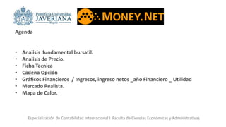 Este documento presenta un análisis fundamental de la acción de Apple. Explica que aunque el precio de la acción cambia constantemente, se mantiene dentro de un buen rango sin caídas o subidas graves. Sin embargo, se ha observado una caída en el precio desde el año pasado debido a que en ese entonces Apple estaba lanzando el iPhone 6, lo que generaba mayor expectativa e interés entre los inversionistas. El documento también incluye una agenda con diferentes temas relacionados al análisis financiero de Apple que serán discutidos.