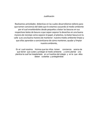 Este documento presenta un proyecto realizado con niños de primaria para concientizarlos sobre el cuidado del medio ambiente. El proyecto incluyó mostrarles un video, realizar un taller de dibujo y una práctica de siembra, con el objetivo de enseñarles la importancia de proteger la naturaleza. El proyecto se llevó a cabo en una escuela primaria y contó con la colaboración de docentes y directivos. Los resultados mostraron que los niños aprendieron sobre el reciclaje y el cuidado de