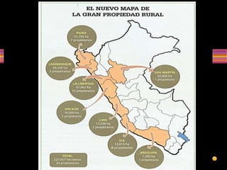 2. Se describe la concentración de tierras en pocas manos en varias regiones del Perú y el surgimiento de grandes propiedades agroindustriales desde la década de 1990.