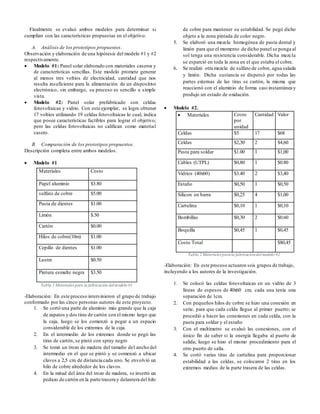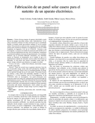 Este documento describe un proyecto para crear un panel solar casero con materiales económicos que pueda alimentar un dispositivo electrónico en un laboratorio. Se propusieron dos prototipos de panel solar y se analizaron, compararon y probaron sus resultados. El prototipo hecho solo con materiales caseros no funcionó, mientras que el modelo que incluyó celdas fotovoltaicas comerciales generó suficiente energía para cargar un teléfono celular. El objetivo del proyecto de crear un panel solar económico y funcional se logró mejor