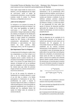 Este documento investiga el conocimiento y uso de las normas de netiqueta entre estudiantes de la Universidad Técnica de Machala, comparando las carreras de Comercio Internacional e Ingeniería Civil. A través de encuestas, se analizan las actitudes respecto a la convivencia virtual en plataformas como Facebook y WhatsApp, identificando ventajas y desventajas asociadas. Se concluye que el conocimiento sobre netiqueta es esencial para promover una comunicación respetuosa y armoniosa en entornos virtuales.