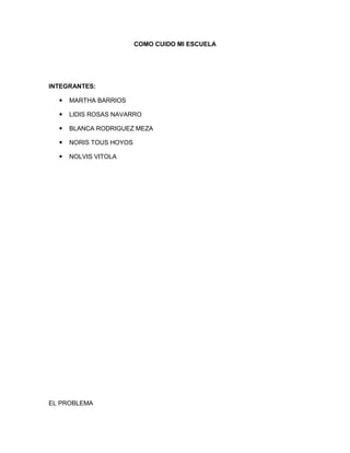 El documento habla sobre un proyecto para mejorar el sentido de pertenencia de la comunidad educativa hacia la sede Nueva Esperanza. Explica que actualmente los estudiantes no cuidan adecuadamente la escuela y propone sensibilizarlos a través de las TIC para que valoren y preserven los recursos de la institución y la comunidad. El objetivo es que desarrollen valores como el respeto, la responsabilidad y el amor por su escuela.
