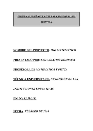 El proyecto 'ojo matemático' busca enseñar geometría a estudiantes de una escuela de enseñanza media para adultos mediante la exploración y fotografía de elementos geométricos en su entorno escolar. A través de actividades prácticas y trabajos en grupo, los alumnos desarrollan habilidades matemáticas y de investigación mientras crean un cuadernillo que documenta sus hallazgos. El enfoque metodológico combinando teoría y práctica busca motivar a los estudiantes y hacer que se sientan protagonistas en su aprendizaje.