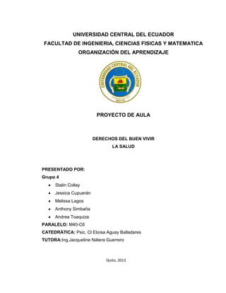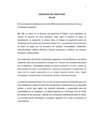 El documento discute el derecho a la salud como parte integral del buen vivir, según la Constitución ecuatoriana. La salud garantiza el bienestar físico, mental y social de los ciudadanos y su satisfacción a través de la disponibilidad, accesibilidad, aceptabilidad y calidad de los servicios de salud. Los autores proponen diseñar pupitres ergonómicos para prevenir enfermedades crónicas en estudiantes y garantizar su derecho a la salud.