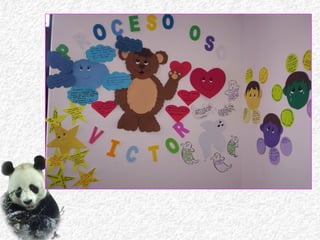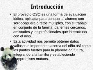 El documento describe el proceso "Proyecto Oso", una evaluación lúdica aplicada para conocer a niños con sordoceguera o discapacidades múltiples que involucra a la familia, amigos y profesionales. El proceso permite obtener datos sobre las fortalezas del niño para planificar su educación e integrar a la familia. A continuación, presenta la historia de un niño llamado Víctor contada como un cuento, describiendo su personalidad, gustos, disgustos, logros y sueños para su futuro.
