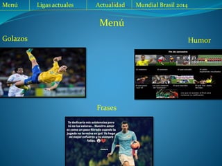 Este documento resume las ligas de fútbol actuales como la Premier League, La Liga BBVA y la Liga MX, así como la Copa Mundial de la FIFA 2014 que se llevará a cabo en Brasil. También incluye secciones sobre goles memorables, frases motivadoras y humor relacionado con el fútbol.
