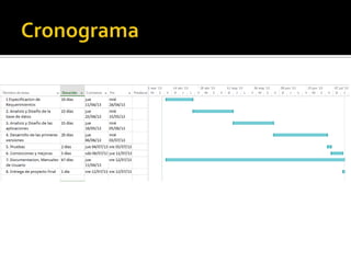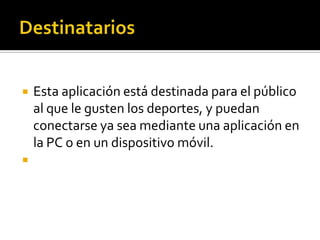 Este documento describe un proyecto para desarrollar aplicaciones móvil y web para proporcionar información deportiva actualizada a los usuarios. Se utilizarán lenguajes como Java, HTML y JSP para generar el contenido. La información se almacenará en bases de datos MySQL y SQLite. El equipo de desarrollo utilizará metodologías como Scrum y generará documentación como especificaciones de requisitos y planes de trabajo.
