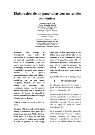Este documento describe la elaboración de dos paneles solares caseros con materiales económicos. El primer panel utilizó materiales como papel aluminio y sulfato de cobre, pero no funcionó debido a la oxidación del aluminio. El segundo panel usó celdas fotovoltaicas y otros materiales y funcionó correctamente al convertir la energía solar en eléctrica. El objetivo era producir un panel solar funcional de bajo costo para recargar dispositivos móviles sin usar la red eléctrica convencional.