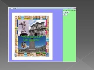 El documento describe un proyecto para crear un juego de Monopolio virtual para 4 jugadores como parte de un curso de Programación II. El juego se basará en las reglas del Monopolio real e incluirá factores humanos como deudas y tratos. Se utilizarán interfaces gráficas de Java y clases como JFrame, ActionListener y recursos como Swing, AWT e imágenes para crear el tablero interactivo y objetos como jugadores, fichas y dados.