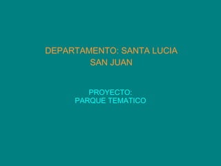 Este documento describe un proyecto para un parque temático en el departamento de Santa Lucía, San Juan. El parque tiene como objetivo equilibrar el desarrollo del departamento y preservar el sistema ecológico. Se dividirá en tres áreas para diferentes edades, incluyendo un área para niños pequeños con juegos de madera y agua, un área para niños mayores con canchas deportivas, y un área para adultos mayores con circuitos para caminar y canchas de bochas.