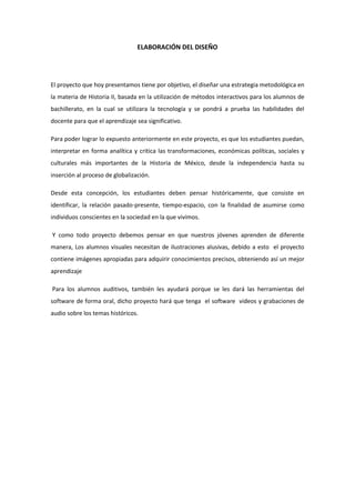 Este documento presenta el diseño de un proyecto para utilizar métodos interactivos basados en tecnología en la enseñanza de la materia de Historia II para estudiantes de bachillerato. El proyecto utilizará software multimedia para incorporar estilos de aprendizaje visuales y auditivos, con el objetivo de mejorar la comprensión de los estudiantes de las transformaciones económicas, políticas, sociales y culturales de México desde la independencia hasta la globalización. El software incluirá contenido organizado en unidades temáticas con actividades interactivas