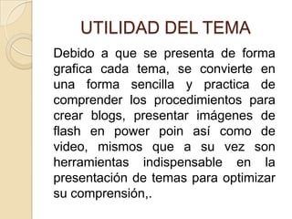 Este documento presenta un resumen de un seminario de informática sobre temas como la creación de blogs, presentación de imágenes y videos en PowerPoint, y el uso de herramientas de presentación. El documento incluye secciones sobre la utilidad del tema, introducción, menú principal y conclusiones y recomendaciones. Fue presentado por Nelson Senon Merida Cano para la Universidad Galileo, tutorizado por el Ing. Roberto de Paz en Quetzaltenango.