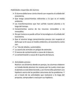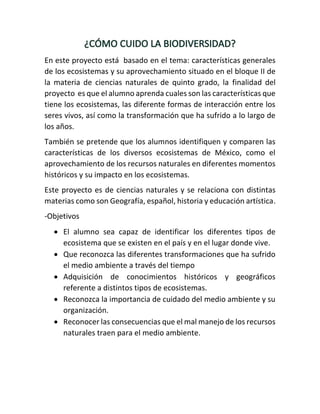 Este documento presenta un proyecto educativo sobre ecosistemas para alumnos de quinto grado. El proyecto busca que los alumnos aprendan sobre las características y tipos de ecosistemas, así como las interacciones entre seres vivos y los cambios ambientales a través del tiempo. El proyecto incluye objetivos, habilidades requeridas, actividades y un cronograma de tres semanas con clases y tareas sobre ecosistemas, recursos naturales y cuidado ambiental.