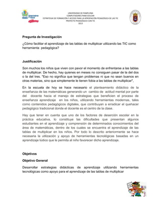 El proyecto de la Universidad de Pamplona busca facilitar el aprendizaje de las tablas de multiplicar mediante el uso de TIC como herramientas pedagógicas, abordando la fobia de los estudiantes hacia las matemáticas. Se proponen estrategias didácticas lúdicas que incluyen el uso de software educativo y actividades audiovisuales para motivar a los niños y mejorar su comprensión. El enfoque se centra en generar un cambio en la enseñanza tradicional, promoviendo un aprendizaje más dinámico y efectivo en las matemáticas.