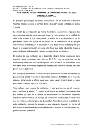 El documento resume el proyecto pedagógico de aula de una institución educativa en Colombia. Describe la misión, visión, objetivos y principios de la institución, así como su enfoque de educación integral y evaluación de estudiantes. También presenta un análisis legal del marco curricular y diagnóstico institucional utilizando la técnica DOFA.