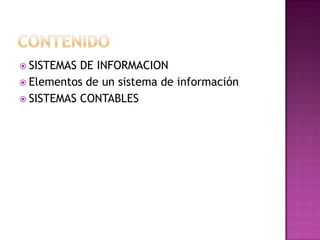 Para implementar un software contable, se debe primero investigar el tema para entender qué se necesita. Un sistema de información procesa datos a través de personas, actividades, recursos para generar información mejorada. Los sistemas contables establecen las reglas para representar la situación económica de una empresa. La investigación es crucial para saber claramente qué se requiere para el proyecto de implementación del software.