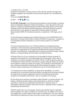 El primer proyecto eólico de República Dominicana fue inaugurado en Pedernales, aportando 33 megavatios al sistema eléctrico nacional. El proyecto consiste en dos parques eólicos construidos con una inversión de más de $100 millones de dólares. El proyecto utiliza aerogeneradores para aprovechar los fuertes vientos de la región y producir energía limpia y renovable.