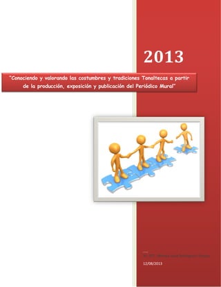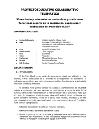 Este documento describe un proyecto educativo colaborativo para producir, exponer y publicar un periódico mural con el objetivo de conocer y valorar las costumbres y tradiciones de Tonalá. El proyecto se llevará a cabo entre agosto de 2013 y febrero de 2014 e involucrará a estudiantes y profesores de un plantel escolar en la planificación, elaboración, exposición y publicación del periódico mural. Se evaluará la participación de los estudiantes en las diferentes etapas del proyecto.