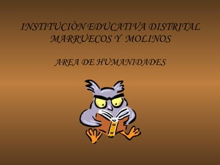 Este documento presenta el Proyecto Institucional de Lectura y Escritura (PILE) de la Institución Educativa Distrital Marruecos y Molinos. El proyecto busca desarrollar las competencias comunicativas de los estudiantes a través de actividades como lectura diaria, elaboración de textos, cineforos y participación en eventos. El objetivo general es suscitar el interés por la lectura para mejorar la expresión escrita-oral y la capacidad crítica. Se implementan metodologías como lectura guiada, proyección