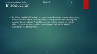 El cuento narra la historia de Sofía, una mujer que pasa todas las navidades sola mirando por la ventana cómo otros celebran en familia. Una noche, un ser diminuto se le aparece y le ofrece ayudarla a vivir su última navidad feliz. Sofía acepta y recibe una invitación a una fiesta navideña donde se divierte con nuevos amigos. Al día siguiente, su casa se incendia y cuando la encuentran, Sofía había fallecido feliz.