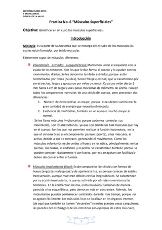 Este documento presenta información sobre los músculos superficiales. Describe las características de los tres tipos de músculos, incluyendo los voluntarios, involuntarios y cardíacos. Explica cómo se clasifican los músculos según su tejido y disposición de los fascículos. También proporciona ejemplos de cómo se nombran los músculos según su tamaño, forma, acción, número de tendones de origen, localización y sitios de origen e inserción. Finalmente, incluye secciones sobre los mú