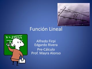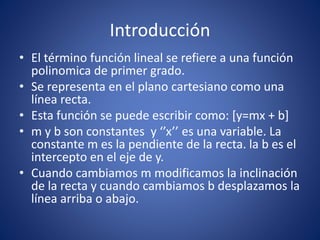 Este documento explica la función lineal y sus aplicaciones en la medicina. Define una función lineal como una función polinómica de primer grado que se representa como una línea recta en un plano cartesiano. Explica cómo la pendiente y el intercepto determinan la inclinación y posición de la línea. Proporciona ejemplos de funciones lineales y cómo se pueden usar para representar datos experimentales como el crecimiento bacteriano en función del tiempo. Finalmente, destaca la importancia de las matemáticas en la medicina y las ciencias.