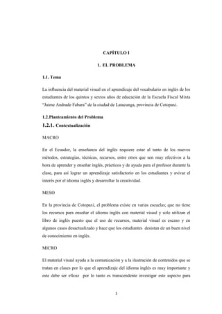 El documento describe una investigación sobre la influencia del material visual en el aprendizaje de vocabulario en inglés de estudiantes en Ecuador. Presenta el contexto y justificación del problema, los objetivos de analizar el impacto del material visual y proponer estrategias para mejorar el aprendizaje de vocabulario. También revisa estudios previos sobre el uso de técnicas visuales y material didáctico en el aprendizaje del idioma.
