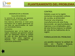 Este documento presenta una investigación de factibilidad para implementar una planta procesadora de pulpa de frutas en Puerto Boyacá con el objetivo de combatir el desempleo en la región y mejorar la calidad de vida de los habitantes. El estudio incluye un análisis de mercado que muestra viabilidad del proyecto, requerimientos de maquinaria, equipo, personal y costos de implementación. De aprobarse, el proyecto generaría empleo y desarrollo económico local.